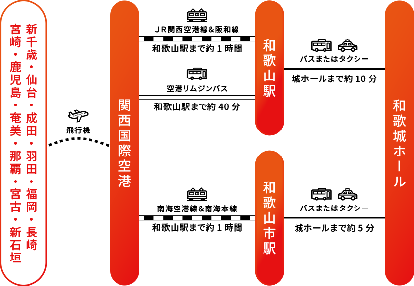バスまたはタクシーで和歌山駅より約10分、和歌山市駅より約5分。和歌山城ホールに隣接。